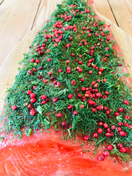 Lachs, Salz, Zucker, Gewürze, Dill, rosa Beeren