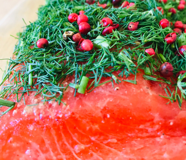Freshly marinated salmon matured in a spice mix made by us. The special consistency and the first short sweet taste, finished with fresh dill and pink berries, end in an aromatic experience, not forgetting the culinary pleasure of the salmon.